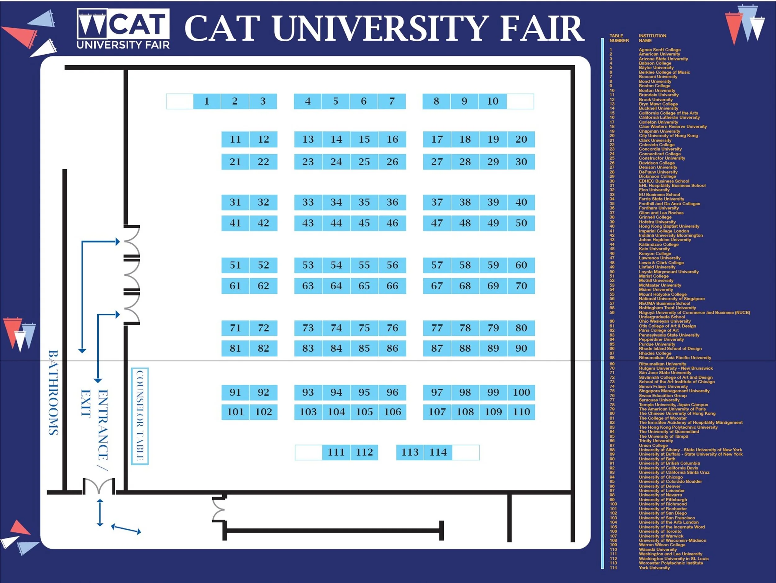 Below is the floor plan of the CAT Fair. The universities are organized in alphabetical order: when you enter the venue, universities beginning with the letter A will be on your LEFT and universities towards the bottom of the alphabet will be on your RIGHT.